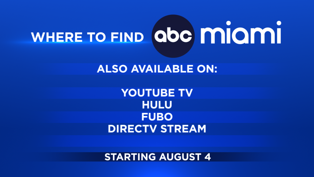 ABC Miami will also be available on YouTubeTV, Hulu, FUBO and DirecTV Stream starting August 4th.