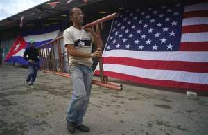 Workers prepare the site for a photo op at the entrance of a new Google technology center that will offer free Internet at the studio of Cuban artist Alexis Leiva Machado, better known as Kcho, in Havana, Cuba, Monday, March 21, 2016. Kcho has long maintained close relationship with the Castro government and became the first independent source of free Internet in Cuba last year when he began offering free WiFi at his studio. (AP Photo/Ramon Espinosa)