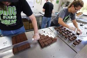 FILE – In this Sept. 26, 2014, file photo, smaller-dose pot-infused brownies are divided and packaged at The Growing Kitchen in Boulder, Colo. Edible marijuana products in Colorado may soon come labeled with a red stop sign as the state is finalizing work on new rules for the appearance of edible marijuana. A draft of those rules released Tuesday, Aug. 11, 2015, would require each piece of edible marijuana to be marked in the shape of a stop sign with the letters THC in the middle. The letters stand for marijuana’s psychoactive ingredient. (AP Photo/Brennan Linsley, File)
