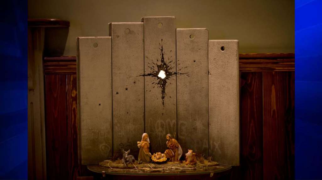 The elusive street artist’s latest work features a “modified nativity” scene: Joseph and Mary kneeling beside Jesus in a manger set beside a monstrous concrete wall.