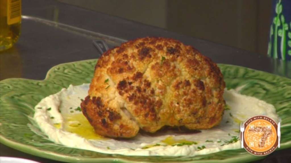 - Grab your serving dish and add a big dollop of the whipped yogurt feta dip to the middle of the plate and then spread outward in a circular motion with the back of a spoon. Once the cauliflower has cooled to the touch place it in the middle of the plate. Drizzle a little more olive oil over the top of the cauliflower and garnish with fresh chopped parsley and pomegranates.