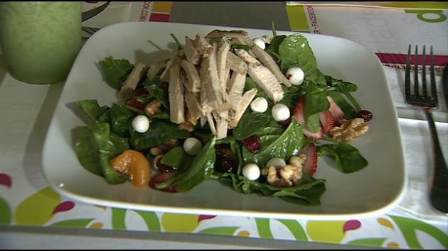 – To make the salad, in a bowl add fresh spinach, the honey vinaigrette, strawberries, mandarin oranges, cranberries and walnuts. Mix well.