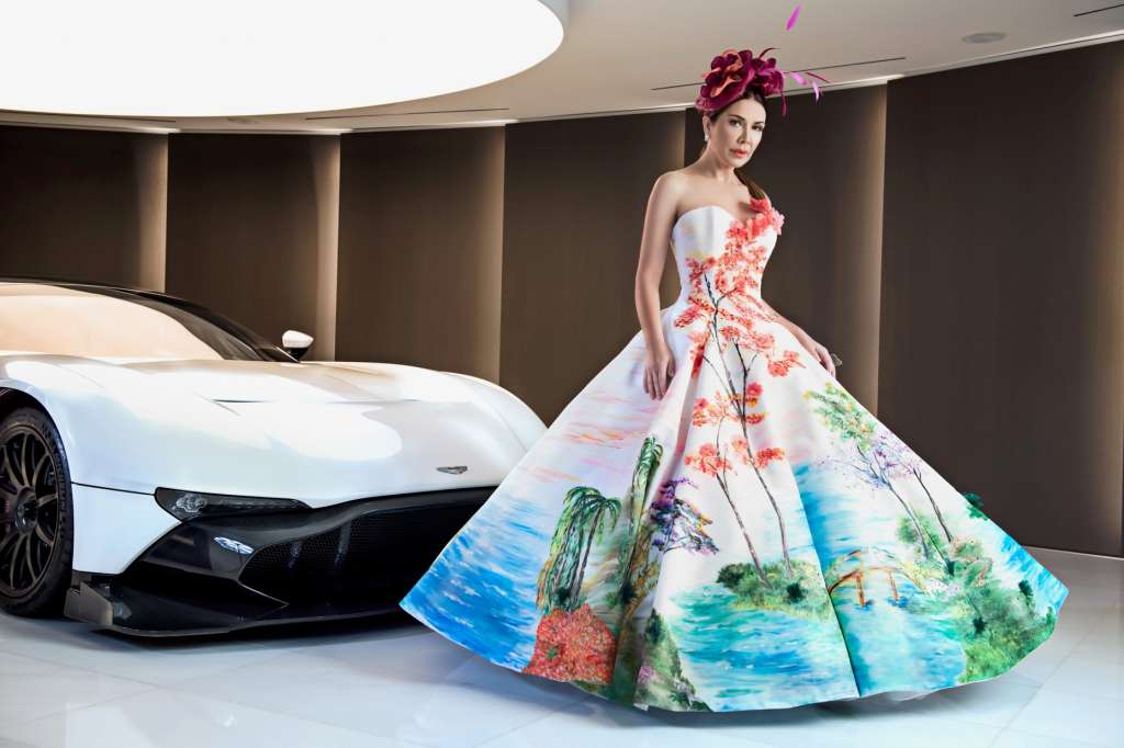 The one-of-a-kind, eye-popping masterpiece was created by Fashion Designer Tammy Apostol (TA Couture) and hand-painted by artist Griselda Lechini. The princess-cut strapless gown features a full skirt with 60 yards of fabric & is embellished with crystals and silk flowers. The combination of impressionism artwork and ornate trimmings allows for a three-dimensional fashion experience. Adding an extra touch of elegance, fascinators from TA Couture’s millinery atelier.
