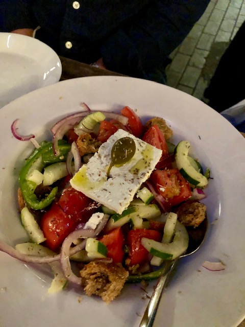 Traditional Greek salad – don’t be fooled authentic Greek salads don’t have any lettuce only tomato, onion, cucumber, olives, capers, green peppers, feta cheese, and herbs