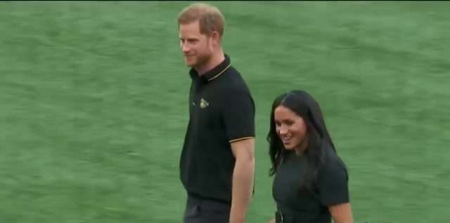 Meghan wore a simple black dress and skipped the spiky heels she sometimes favors for her walk on the infield dirt (brought from the U.S.) and artificial turf (from France.) Harry wore black slacks and a matching shirt.