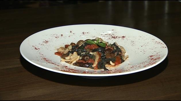 – Now it’s time for the pasta. Chef Igor made Tagliolini colored with squid ink, which gives it a salty flavor. You can make your own or buy it fresh at many grocery stores. Dry pasta works just as well, though, if you prefer. If you’re using fresh pasta, put it in boiling water for about three minutes. When it’s ready, take the garlic out of the seafood and pour the pasta into the pan. Give it a toss to mix well.