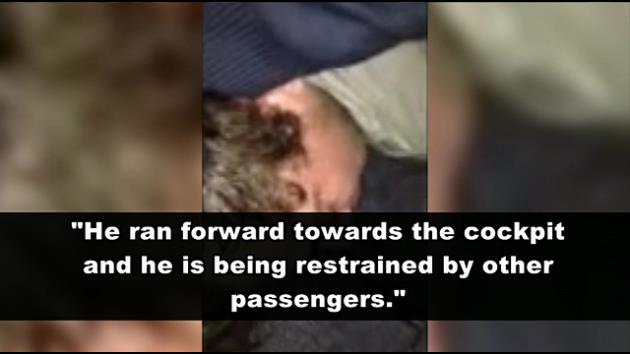 He said his wife told him she noticed the man acting strangely before the flight, constantly moving his bag from one overhead bin to the next. Tellam’s wife told him that shortly after takeoff, the man ran forward in the cabin, through the first-class cabin where she was sitting and almost to the cockpit before three other passengers stopped and restrained him.