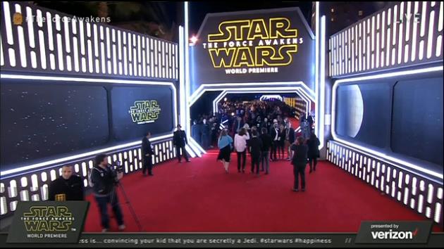 Abrams and Lucas posed together for photos, and both men took time to chat with fans before heading into the premiere. Original trilogy cast members Mark Hamill and Billy Dee Williams attended, as did series newcomers Max von Sydow, Gwendolyn Christie, John Boyega and Daisy Ridley.