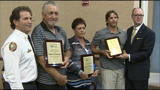 Pompano Beach Mayor Lamar Fisher, city commissioners, and Fire Chief John Jurgle are recognizing Robbie Burning, Cynthia Kopenski and Larry Ferris after they helped three victims when their plane crashed on April 25.