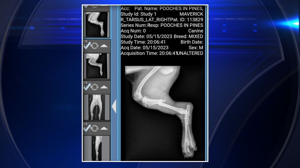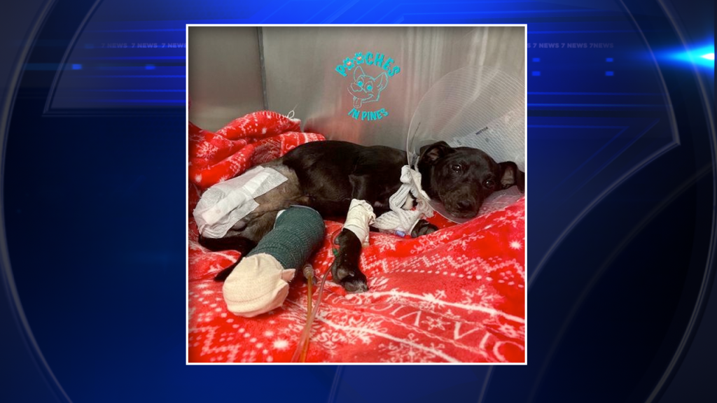 “His other leg had infections very, very deep, down to the bone, so it was like necrotic flesh, and some other injuries that were consistent with blunt force trauma, so I definitely think it’s an abuse case,” said Angela Goodwin with Pooches in Pines Rescue.