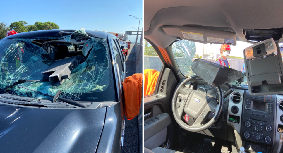 Delray Beach Fire Rescue posted photos on Facebook showing the massive piece of metal in the windshield of the man’s truck, Tuesday.