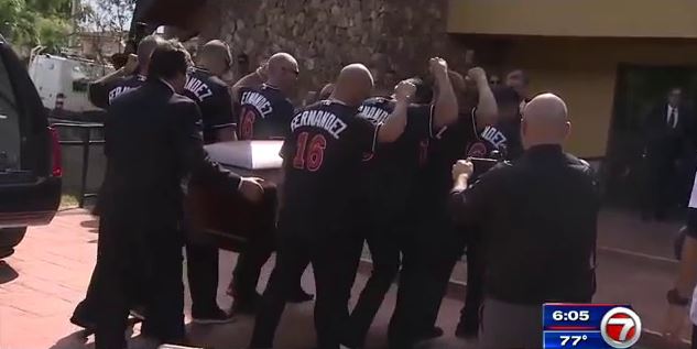 Marlins owner Jeffrey Loria, manager Don Mattingly, hitting coach Barry Bonds and the players including Marcel Ozuna and Giancarlo Stanton wore white T-shirts emblazoned with Fernandez’s image and the letters “RIP” as they slowly walked the hearse away from Marlins Park in Miami’s Little Havana neighborhood Wednesday. Many in the crowd of about 1,000 chanted “Jose! Jose!” and some waved Cuban flags in honor of the popular Cuban-American player.