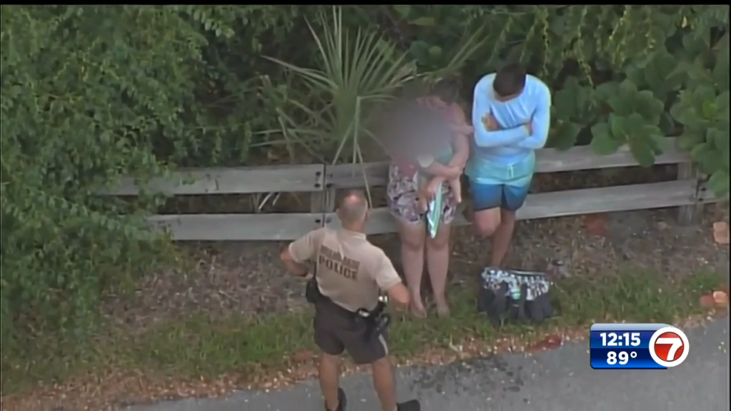 A couple and their child were seen sitting at the entrance of Crandon Park in Key Biscayne, Monday morning.
