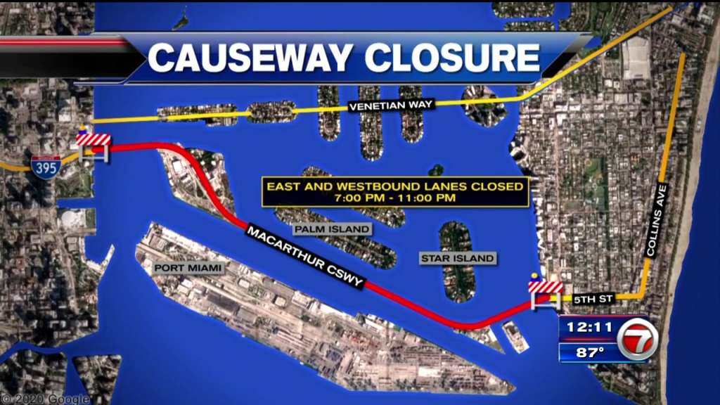 The MacArthur Causeway will be closed from 7 p.m. to 11 p.m. to motorists, cyclists and pedestrians.
