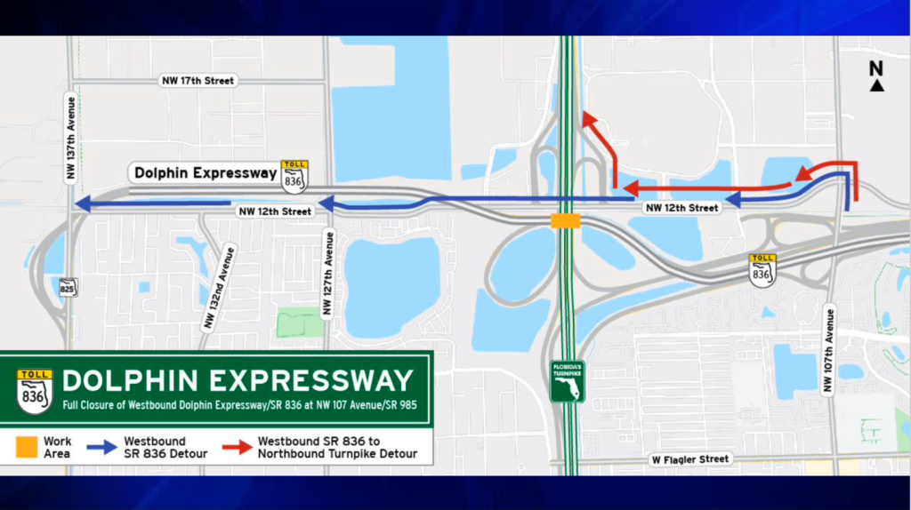 NORTHWEST MIAMI-DADE, FLA. (WSVN) - Florida’s Turnpike Enterprise will be closing the westbound Dolphin Expressway/State Road 836 all weekend to allow crews to perform bridge work on the Florida Turnpike.