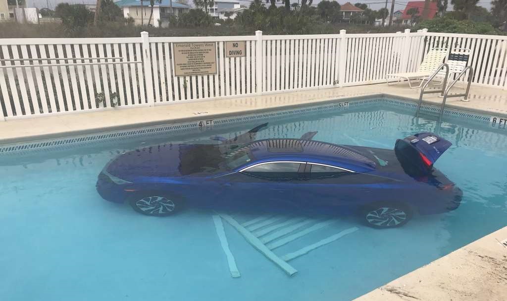 OKALOOSA ISLAND, Fla. (WSVN) — A north Florida mother forgot to put her car in park and it plunged into a pool with her husband and daughter still inside.