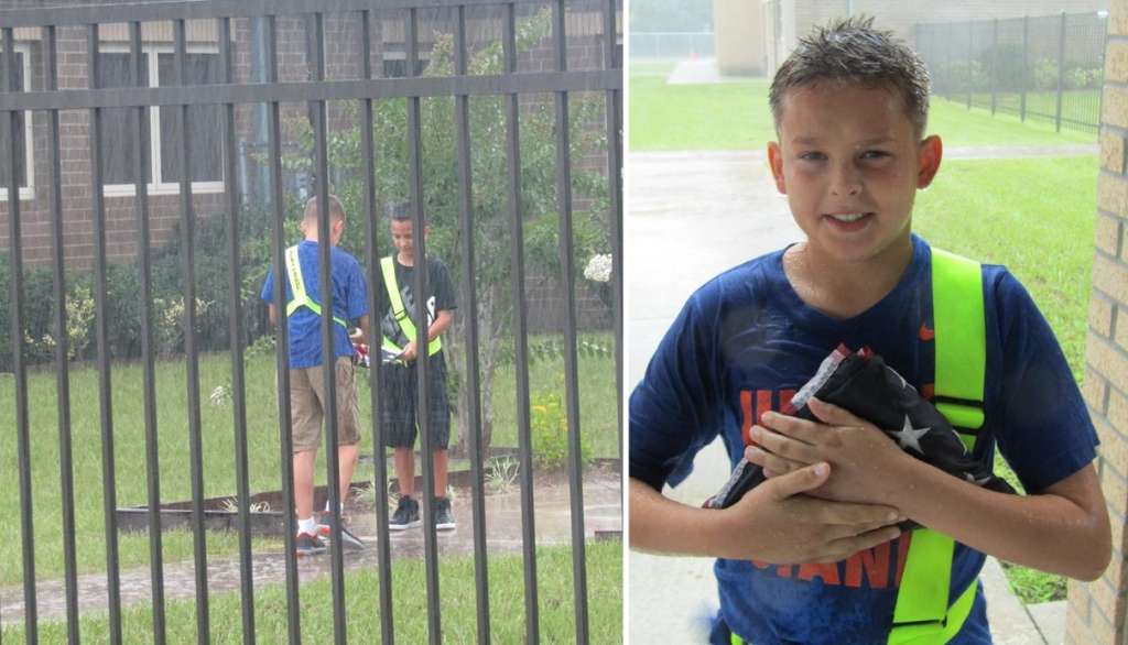 School officials posted photos of the two 11-year-olds bringing the flag down and completing the 13 folds, all while getting drenched in the pouring rain.