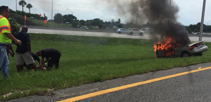 #BREAKING bystander rescues man from burning car. Transported to N Broward Hosp. Turnpike and Sunrise. #Lauderhill pic.twitter.com/aKyxH5I69t