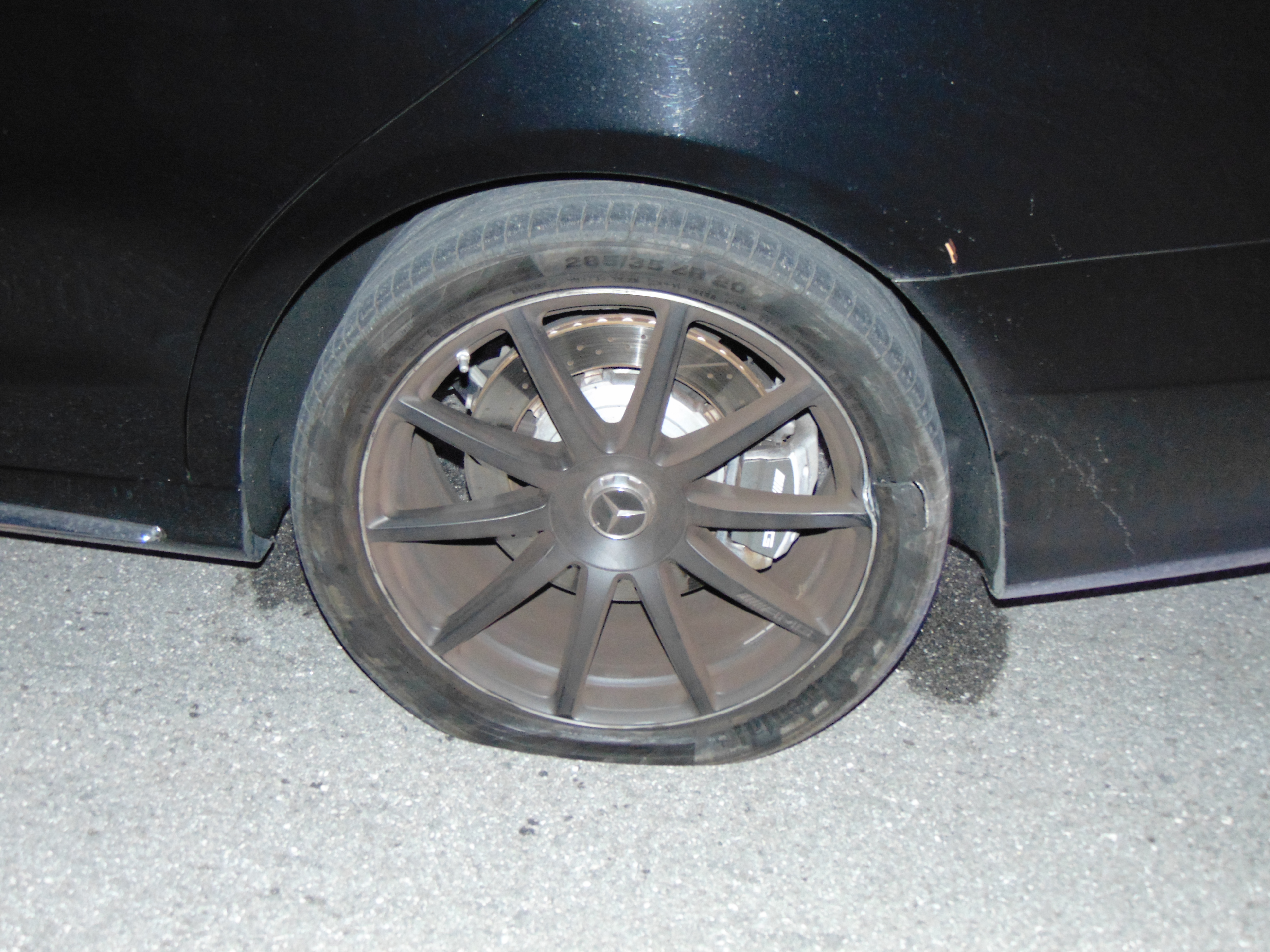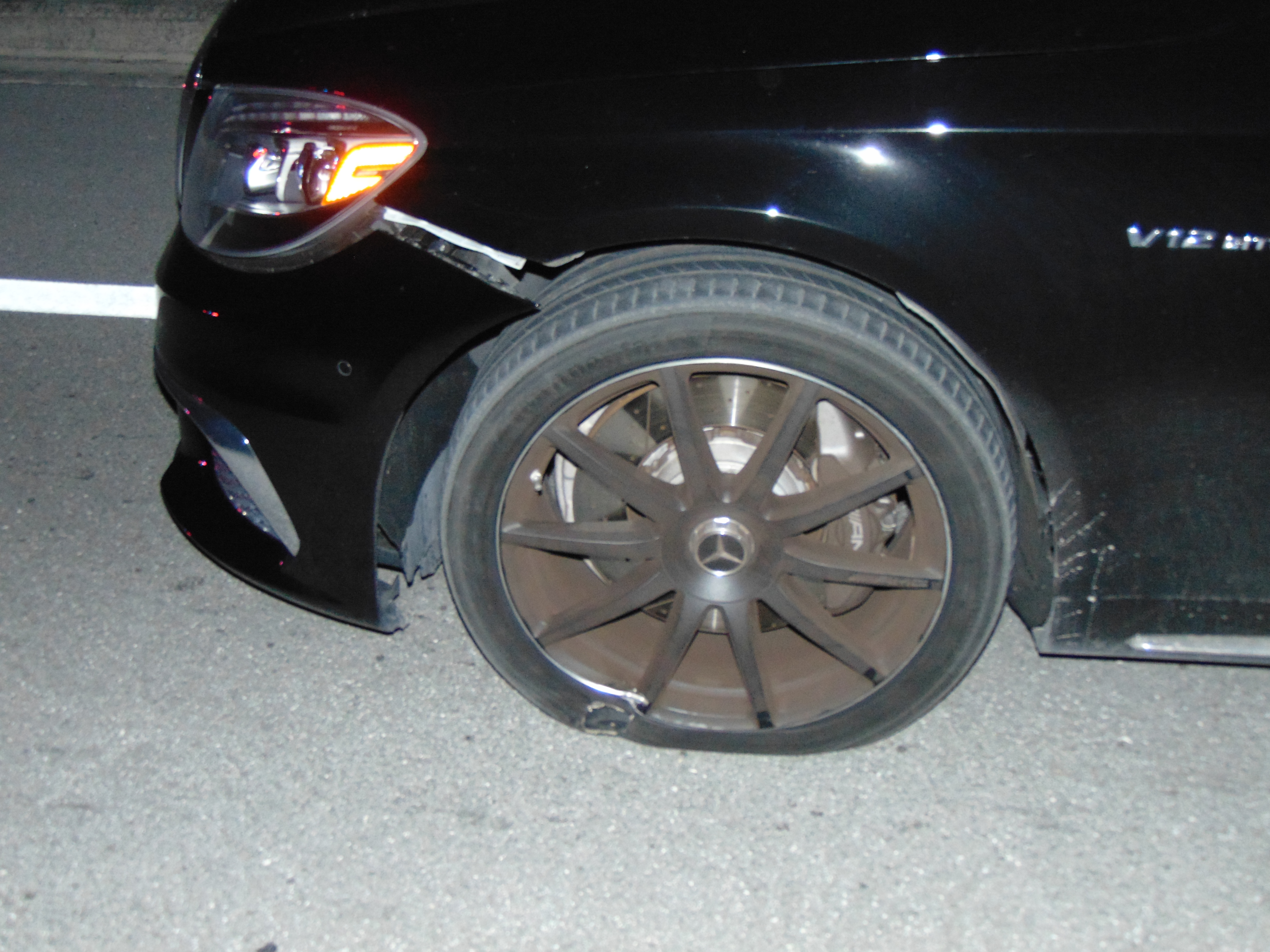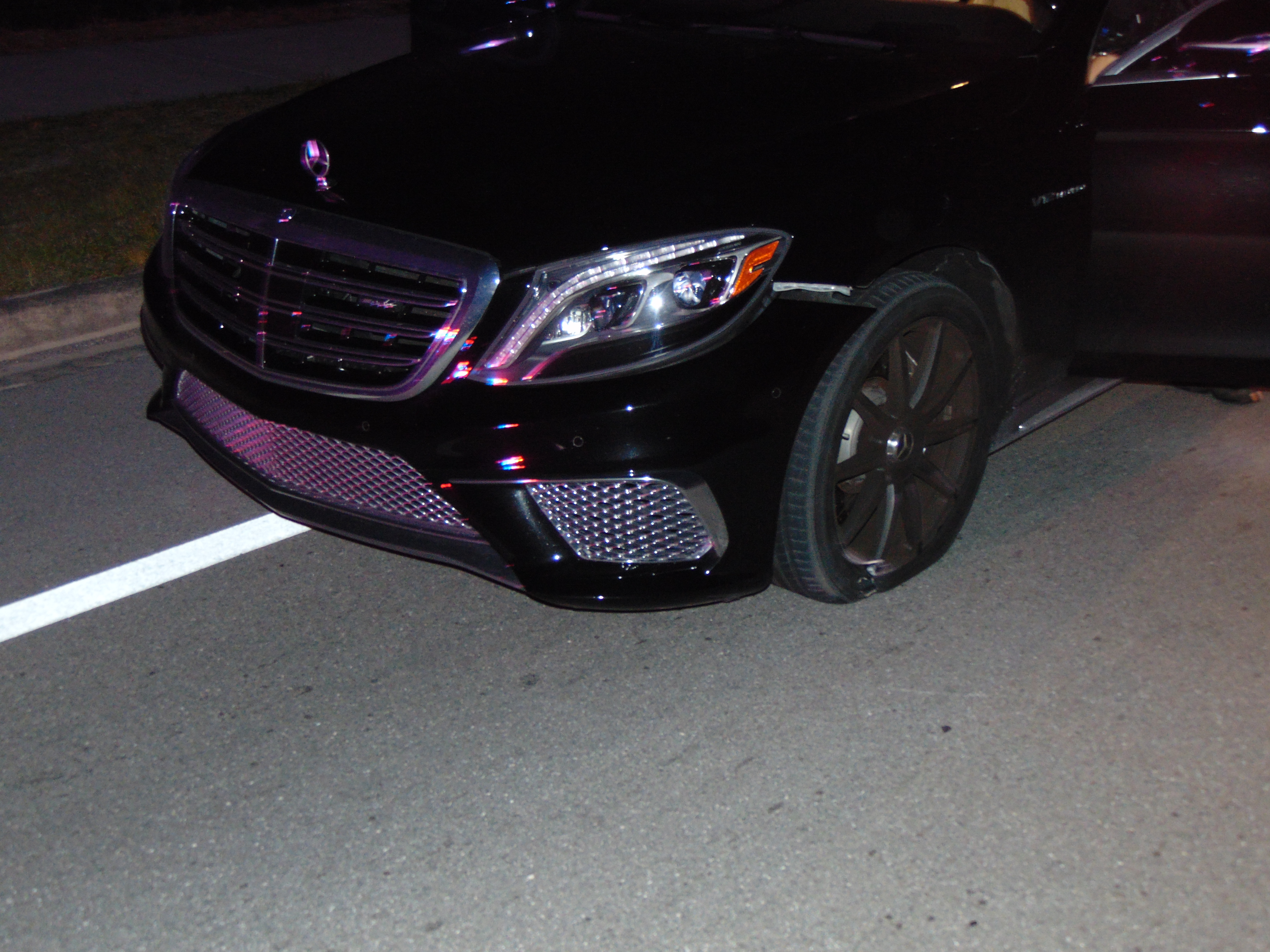 Police found the Woods sound asleep behind the wheel, according to an incident report. The engine was running, the brake lights were on and the right turn signal was blinking. Police also released photos of his car that showed both tires flat and minor damage around the bumpers.