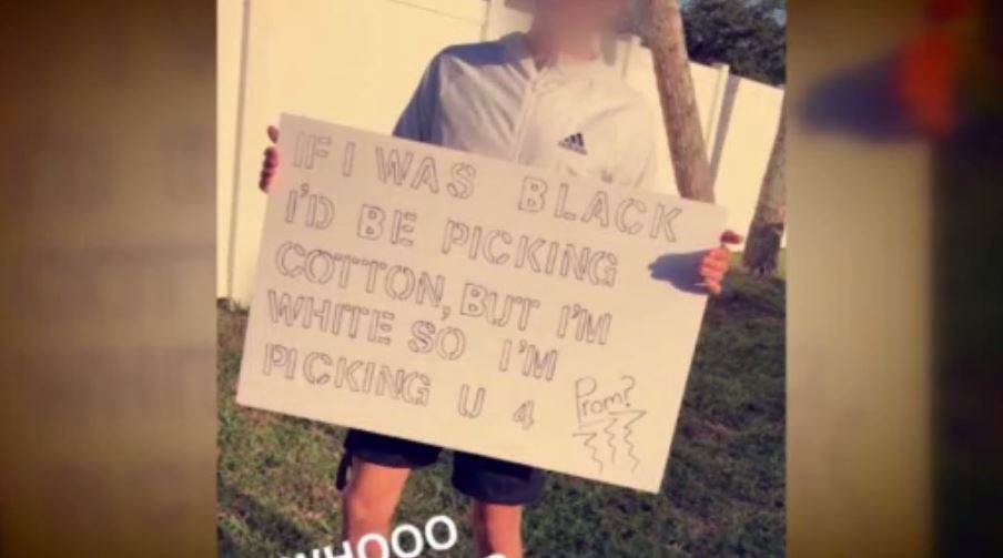 The Herald-Tribune reports the 18-year-old Riverview High School student’s sign read: “If I was black, I’d be picking cotton, but I’m white, so I’m picking u 4 prom.”