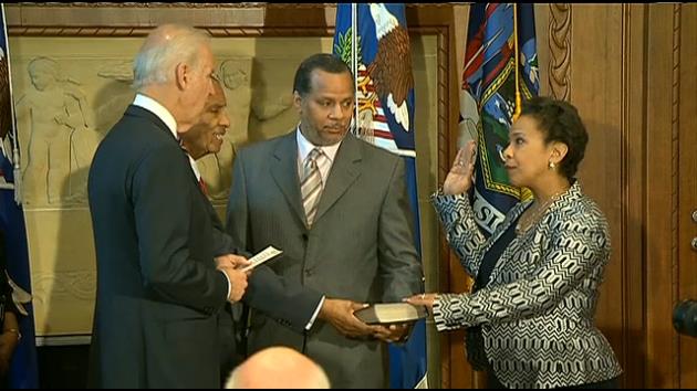 Vice President Joe Biden administered the oath of office to Lynch at a Justice Department ceremony. Lynch replaces Eric Holder, who left the job Friday after six years as attorney general.