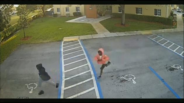 Surveillance video inside a parking lot captured the scene after two people in hoodies approached the vehicle, Tuesday night. There appeared to be a scuffle inside the car, and then the two men could be seen running off.