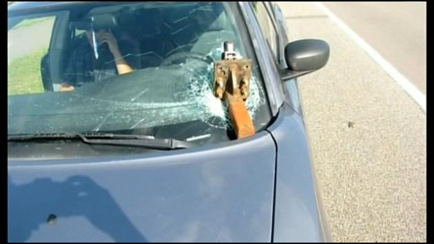 The near 30-pound object missed Pozorki by luck and ended on his car’s dashboard. "My first reaction was to put my knee on the steering wheel, and I put my arms up at a cross," said Pozorki. "It sounded like someone strapped a piece of dynamite onto my windshield."