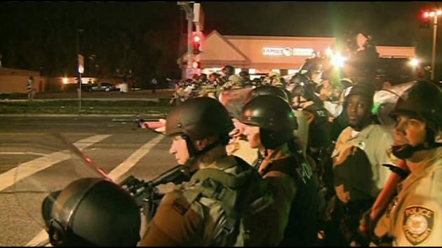 FERGUSON, Mo. (AP) — The National Guard arrived in Ferguson but kept its distance from the streets where protesters clashed again with police, as clouds of tear gas and smoke hung over the St. Louis suburb where Michael Brown was fatally shot by a police officer.