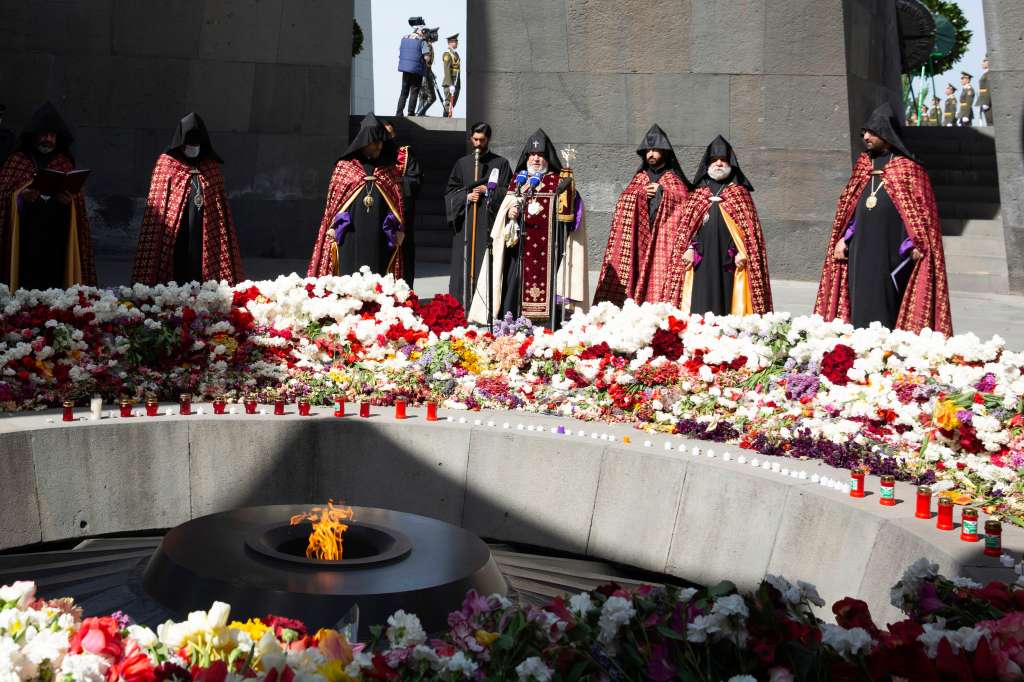 In Armenia on Saturday, people streamed to the hilltop complex in Yerevan, the capital, that memorializes the victims. Many laid flowers around the eternal flame, creating a wall of blooms two meters (seven feet) high.