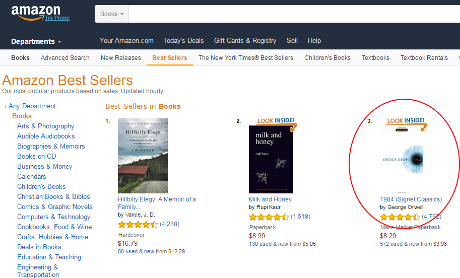 The Amazon bestseller list is updated hourly, so “1984’s” time near the top may not last long. It currently sits just after Connor Franta’s “Note to Self” and before Margot Lee Shetterly’s “Hidden Figures.”