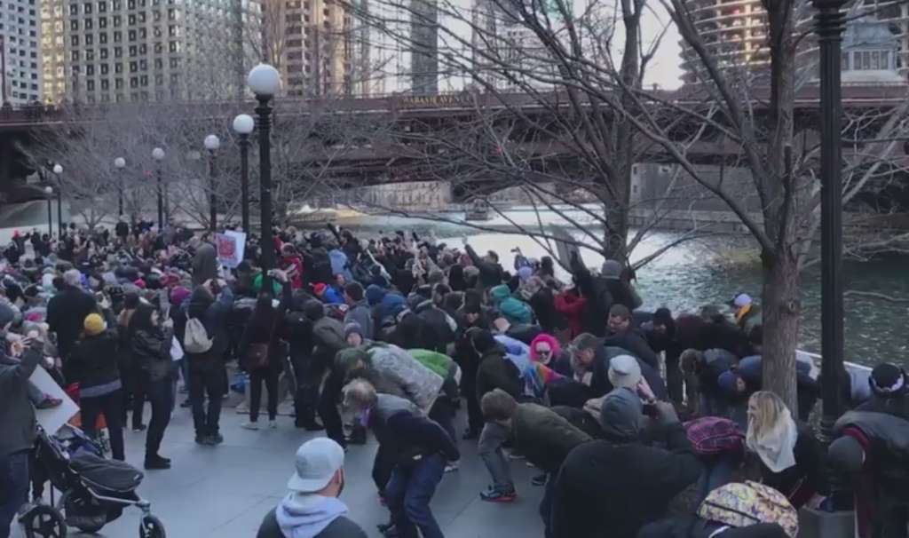 (WSVN) - Hundreds gathered on Chicago’s riverfront Sunday to moon Trump Tower.