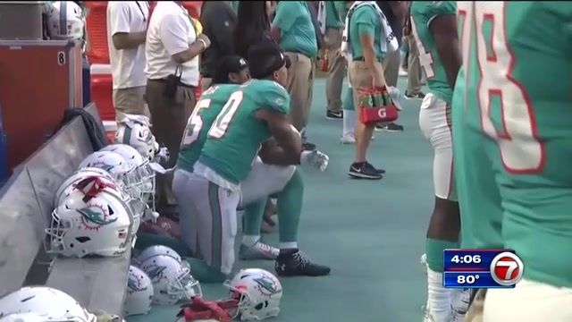 At Miami, Dolphins receivers Kenny Stills and Albert Wilson and defensive end Robert Quinn protested during the anthem. Stills and Wilson kneeled behind teammates lined up standing along the sideline. Quinn stood and raised his right fist. There were no apparent protests by the Buccaneers.