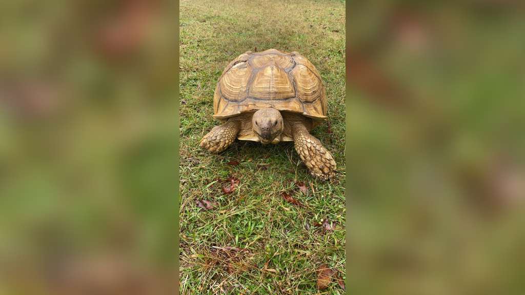 The man owned land about 30 miles away and, thinking that Sparkplug was a turtle and enjoyed being in the water, dropped off the hefty tortoise at a pond on his sprawling country property. He didn’t know then that the “turtle” he’d found on the side of the road was a beloved African spurred tortoise who’d run away from home.