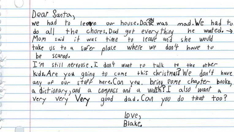 Blake goes on to say he is scared to talk to the other children at the shelter and asks Santa if he will come this Christmas.