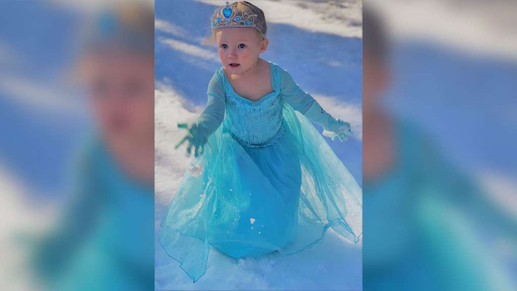 Wearing her Elsa dress, crown and gloves, she stepped into the snow for the first time in her life and reenacted her favorite scene from the movie “Frozen.”