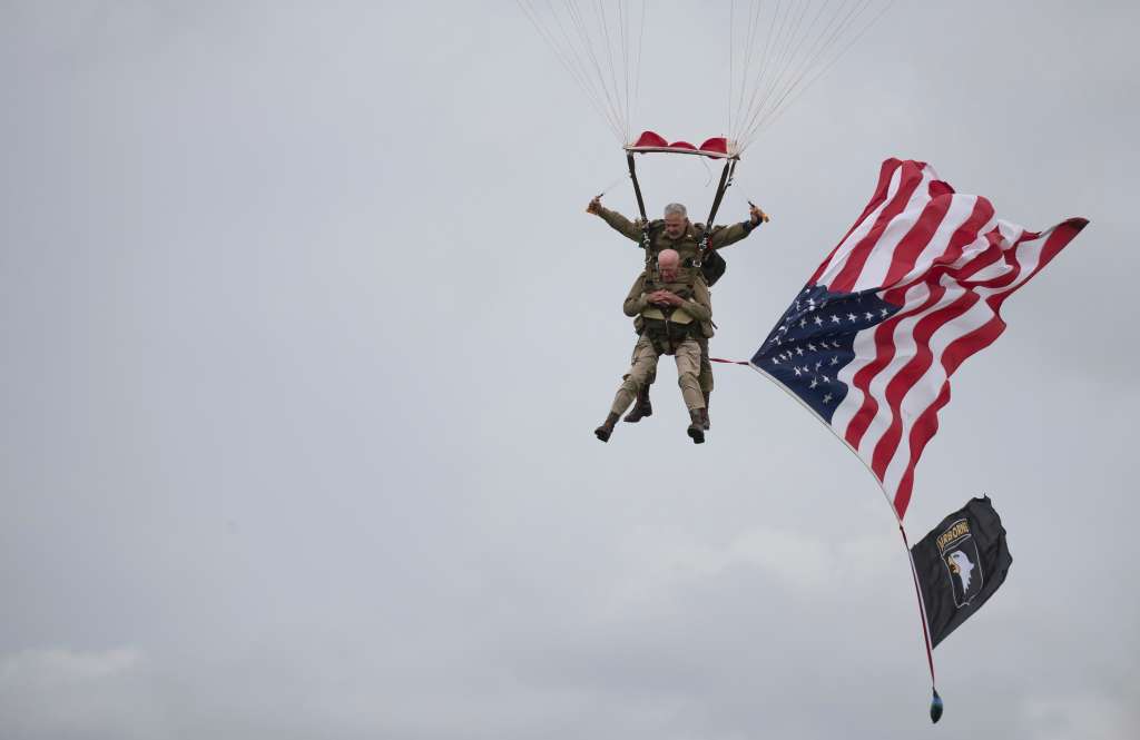 Those on the ground watched the anxiety-inducing descent as, strapped to another parachutist dangling beneath a red, white and blue canopy, the old man coasted through the sky, another gigantic American flag billowing out behind him.
