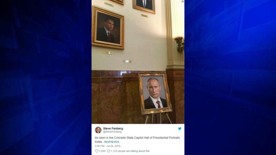 Colorado State Sen. Steve Fenberg, a Democrat, tweeted a photo of the Putin painting, writing, “As seen in the Colorado State Capitol Hall of Presidential Portraits today…#putinpotus.”