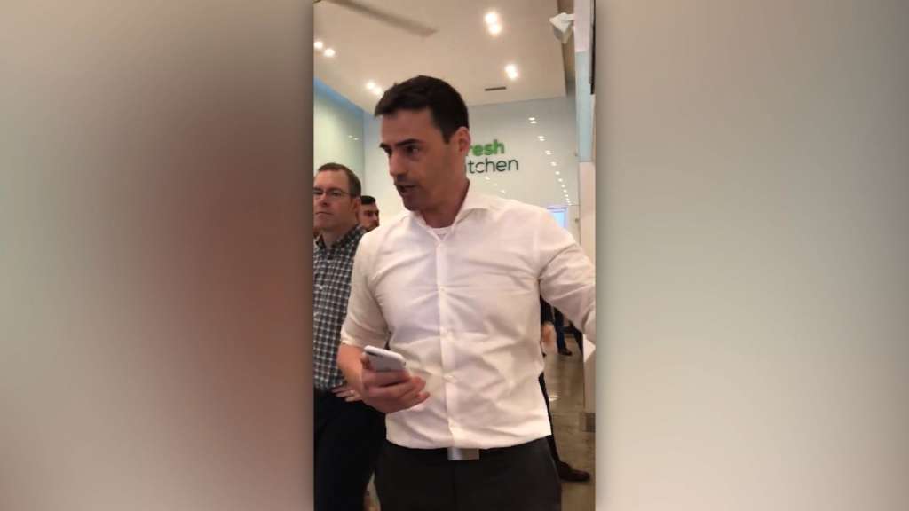 He continues to express his displeasure to an employee and threatens to call Immigration and Customs Enforcement officials.
