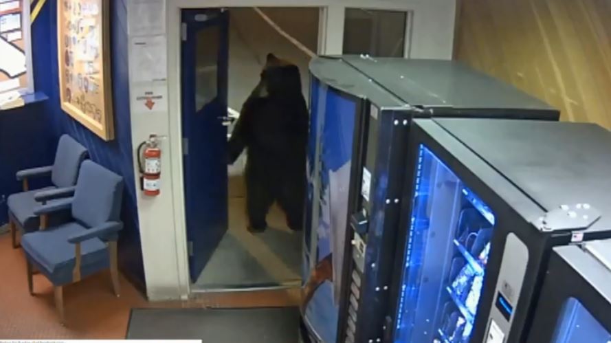 The animal has a peek inside and then pulls the door open. It drops to all fours and wanders past a vending machine and into the office in Truckee, north of Lake Tahoe.