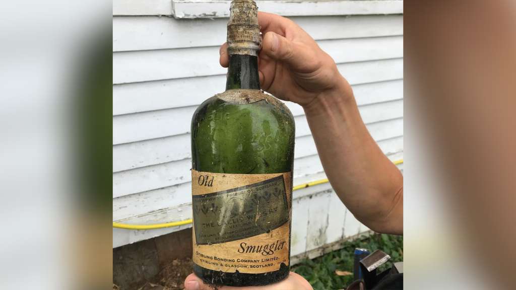 The liquor is a brand of Scottish whiskey labeled Old Smuggler Gaelic whiskey, which is still made today. Each bottle was wrapped in tissue paper and straw and bundled in a package of six, said Drummond.
