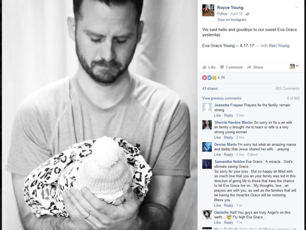 Keri and Royce Young wrote an emotional update on Facebook about the day they gave birth to their baby girl Eva. It was also the day she died.