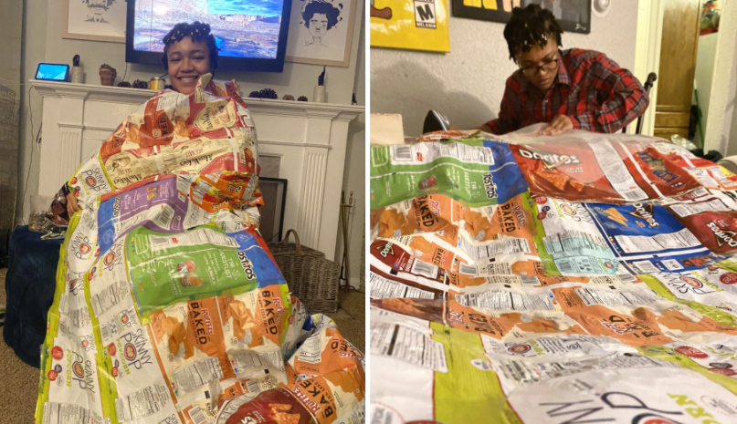 The idea came from an online video of a woman in England who fashioned sleeping bags from empty snack pouches.