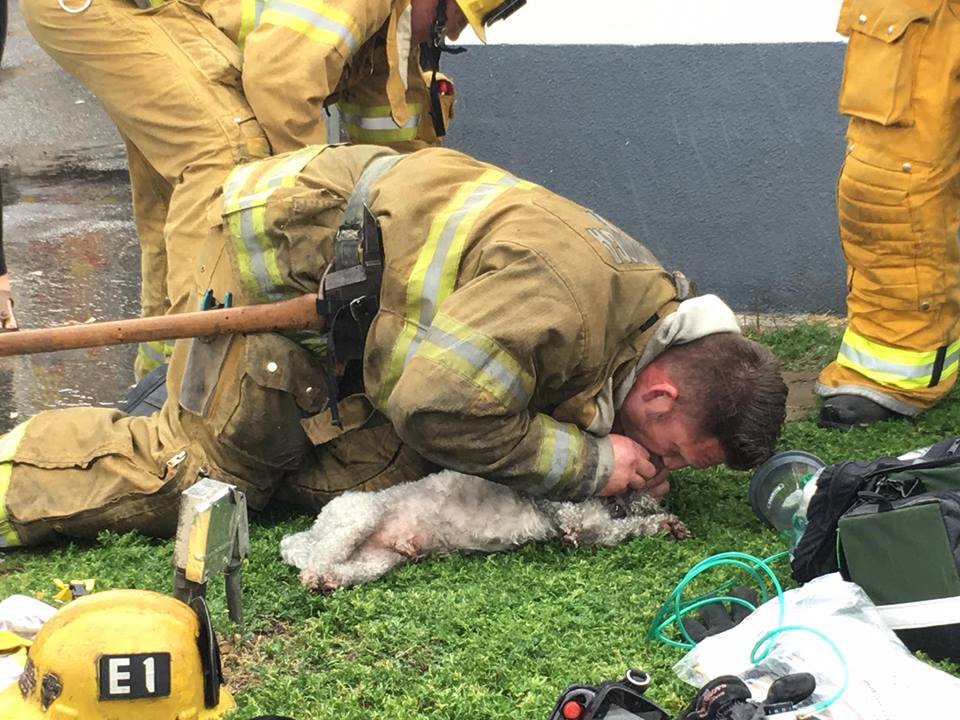 SANTA MONICA, Calif. (AP) — California firefighters who spent 20 minutes performing mouth-to-snout resuscitation on a dog they rescued from a burning apartment are being hailed as heroes.
