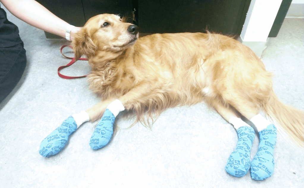 “Olaf walked over a mile on the Fish Trap Trail before his owner realized his pads were burned, and even then he wasn’t whining or limping! He is one tough cookie (and exceptionally sweet cookie),” the hospital wrote.