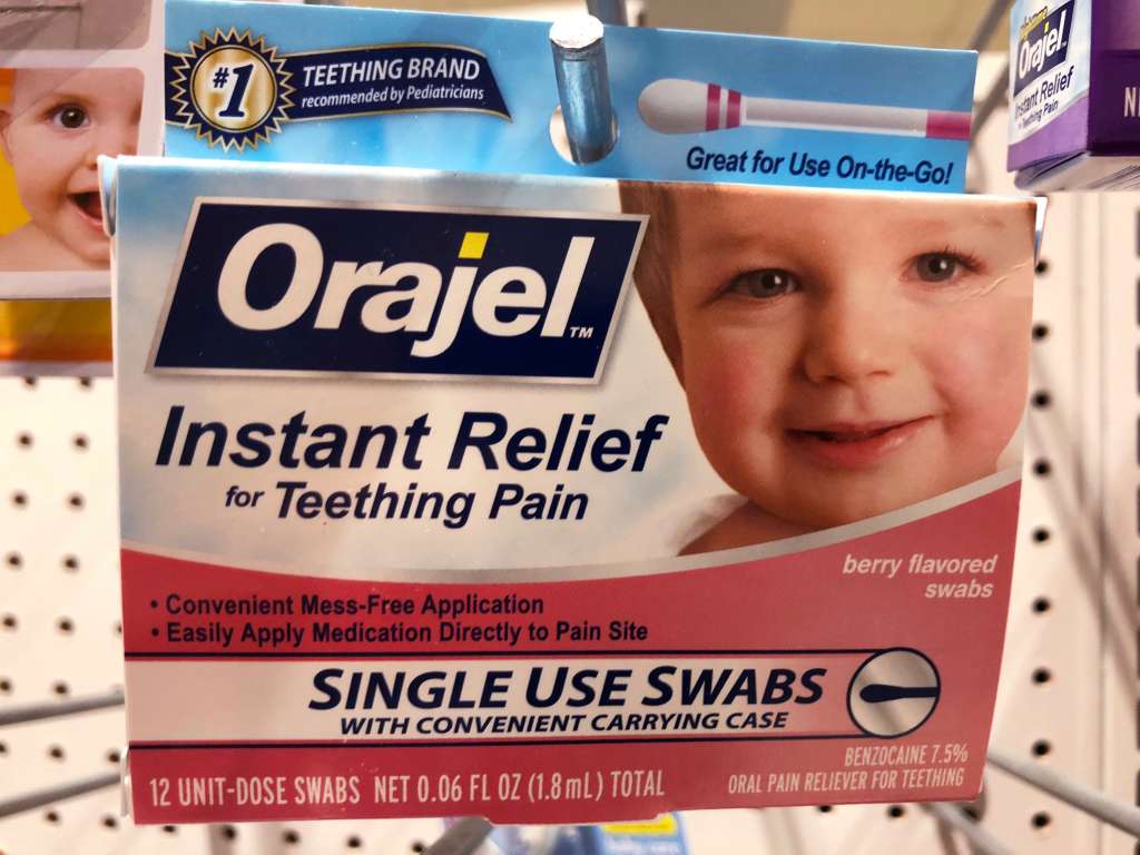 Teething products with benzocaine include Baby Orajel. The packaging states: “Instant relief for teething pain.”