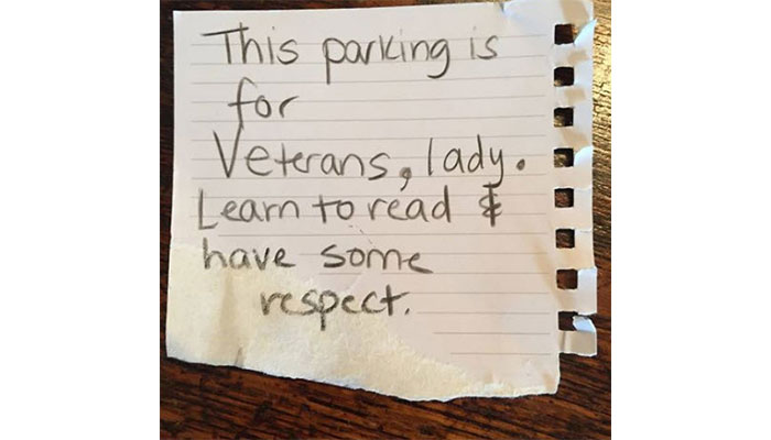 Rebecca Hayes says she came out of a grocery store and found a note on her car that read, “This parking is for Veterans, lady. Learn to read and have some respect.”
