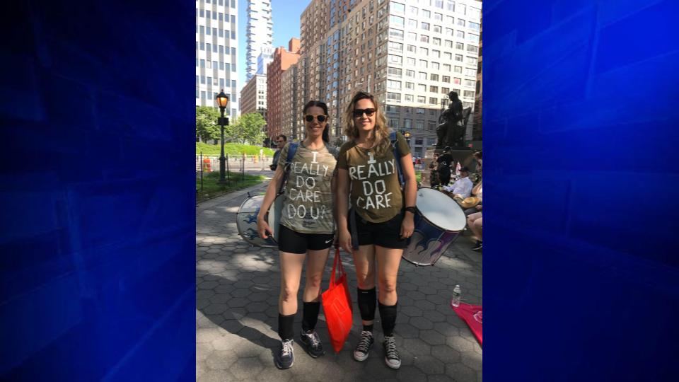 In New York, protesters Annie Scott and Fernanda Kock wore olive green T-shirts with the message “I Really Do Care” on the front.