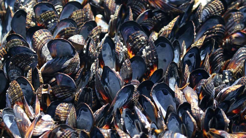 When mussels are alive and healthy, their shells remain pressed together. When a mussel dies, those shells open up, exposing the internal tissue or an empty shell.