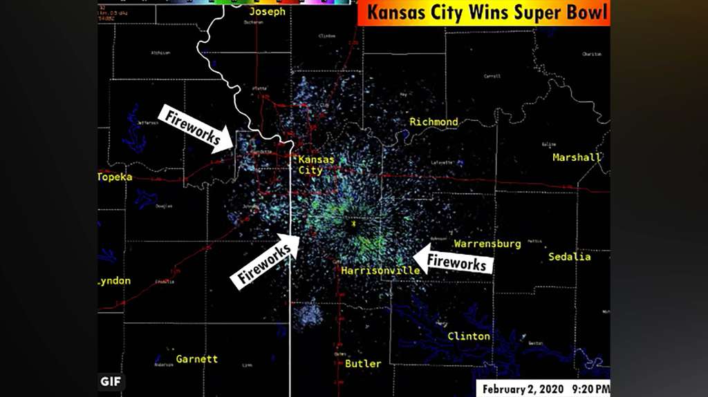 The fireworks could be seen as far South as Clinton and Butler, Missouri, which are about an hour’s drive away from Arrowhead Stadium, where the Chiefs play their home games. They also spilled across the border into Kansas.