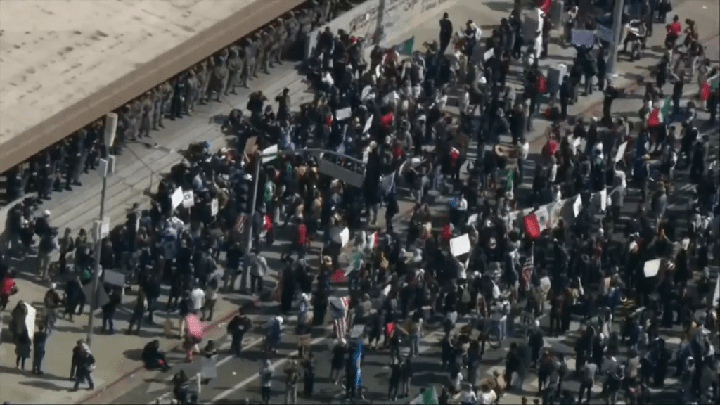 The protests began Friday after federal immigration raids arrested dozens of workers in Los Angeles. Protesters blocked a major freeway and set cars on fire over the weekend, and police responded with tear gas, rubber bullets and flash-bang grenades.